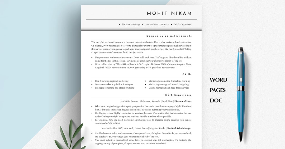1-page resume template2-page resume templateMatching cover letterMatching reference pageFont file for seamless editingResume writing eBookCover letter writing eBookAction verbs eBookResume checklistInterview trackerInterview preparation kitPhoto frame optionsIcon Library (400+ icons for customization)Printing guide and 100+ motivational quotes