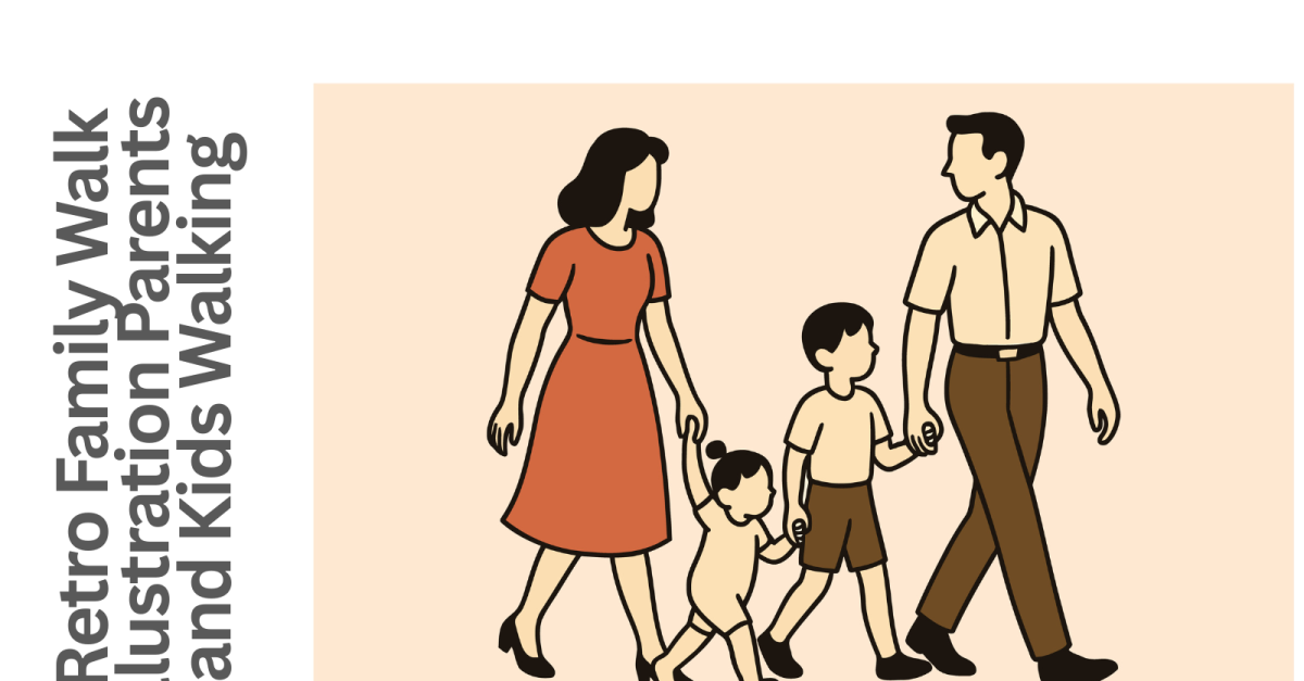 heartwarming vector illustration of a family walking hand in hand, featuring a mother, father, and two young children. This faceless retro-style artwork uses a muted color palette, perfect for parenting blogs, family-themed prints, educational materials, and nostalgic family values content. Ideal for Creative Fabrica, Freepik, and vector marketplaces.