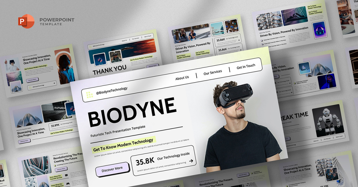 Biodyne – Futuristic Powerpoint Template Futuristic Technology & AI, Futuristic Design & Architecture – Powerpoint Template — Simple, clean, minimalist, modern, and professional presentation template. It is a multipurpose business presentation template. Perfect for modern technology company, futuristic design & architecture, gadget & tech innovation business, virtual reality, project proposal, startup pitch...