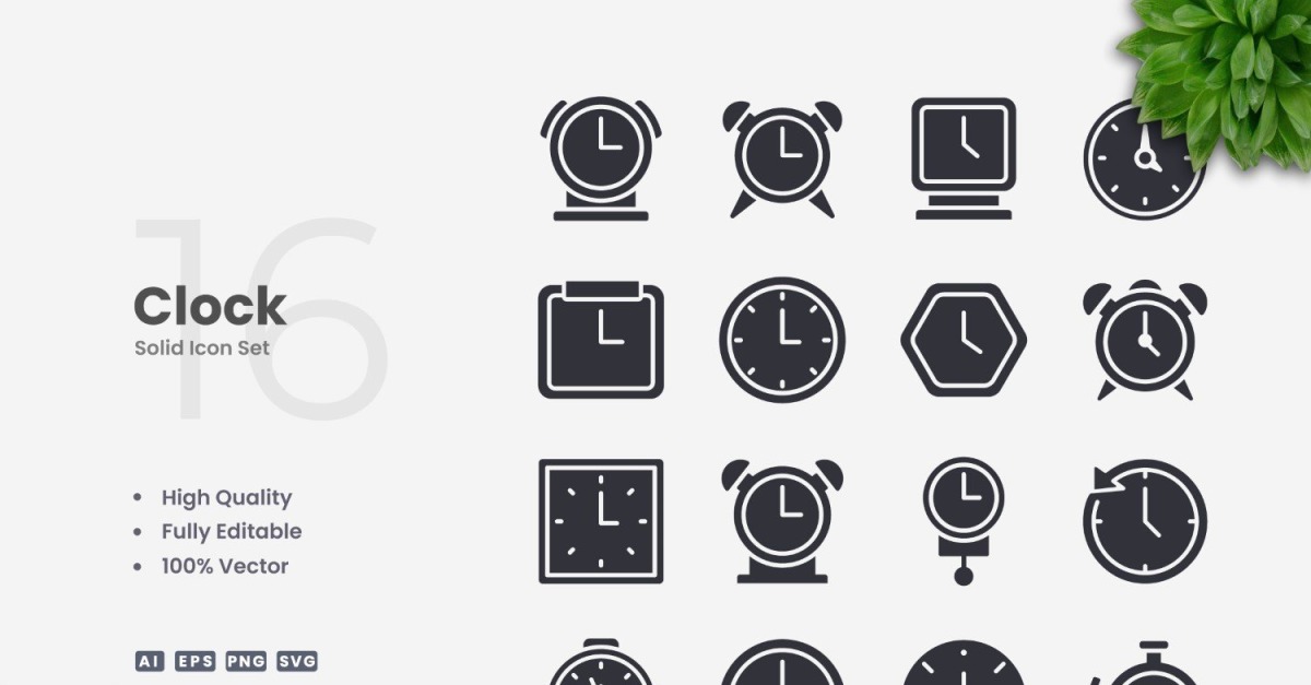 Set of 16 Clock Solid Icons | Simple and clean design, perfect for websites, mobile apps, books, social media, infographics, flyer, print, banners, posters and many more. To resize or change color you can easily edit on vector software like Adobe Illustrator and CorelDRAW. Features : High Quality Design100% Vector100% CustomizableEasy Drag and Drop Files Included...
