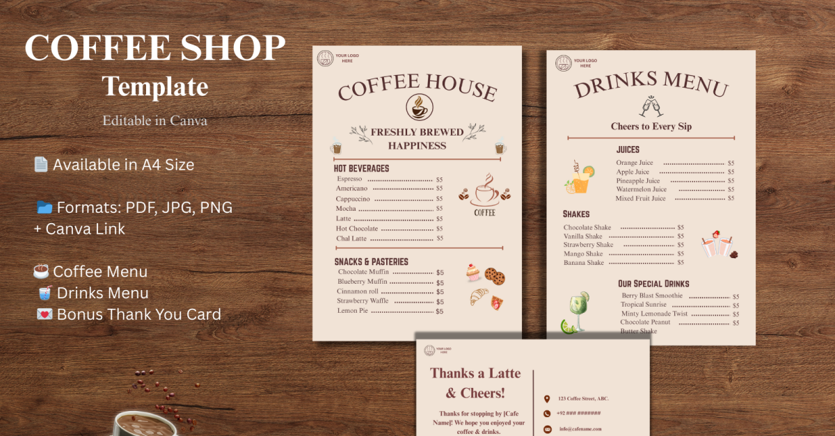 Create a stunning restaurant menu with this editable Canva template! Perfect for coffee shops, cafes, and restaurants. This template includes: Coffee & Drinks Menu – Fully customizable and print-ready.Bonus Thank You Card – Add a personal touch for your customers.A4 Size – Easy to print or share digitally.Formats Included – PDF, JPG, PNG, and Canva...