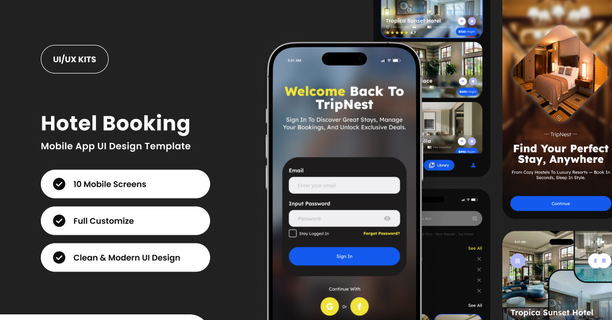 Tripnest offers a comprehensive UI kit for hotel bookings, integrating all necessary features for a complete reservation experience. Ideal for full-featured travel apps. **Highlights:** – High-quality and professional screen layout design – Fully customizable and easy-to-edit components – Well-organized and neatly structured layers – Uses open-source fonts for flexibility – Included file formats: `.fig`, `.sketch`,...