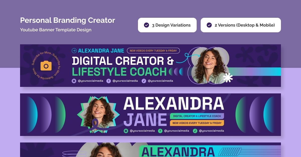 Make your channel unforgettable with this creative YouTube banner template that blends modern minimalism and retro vibes. Perfect for influencers, freelancers, and lifestyle creators, this design balances bold shapes with clean typography for a professional yet playful feel. The banner highlights your personal brand with flexible layouts where you can feature your name, niche, or...