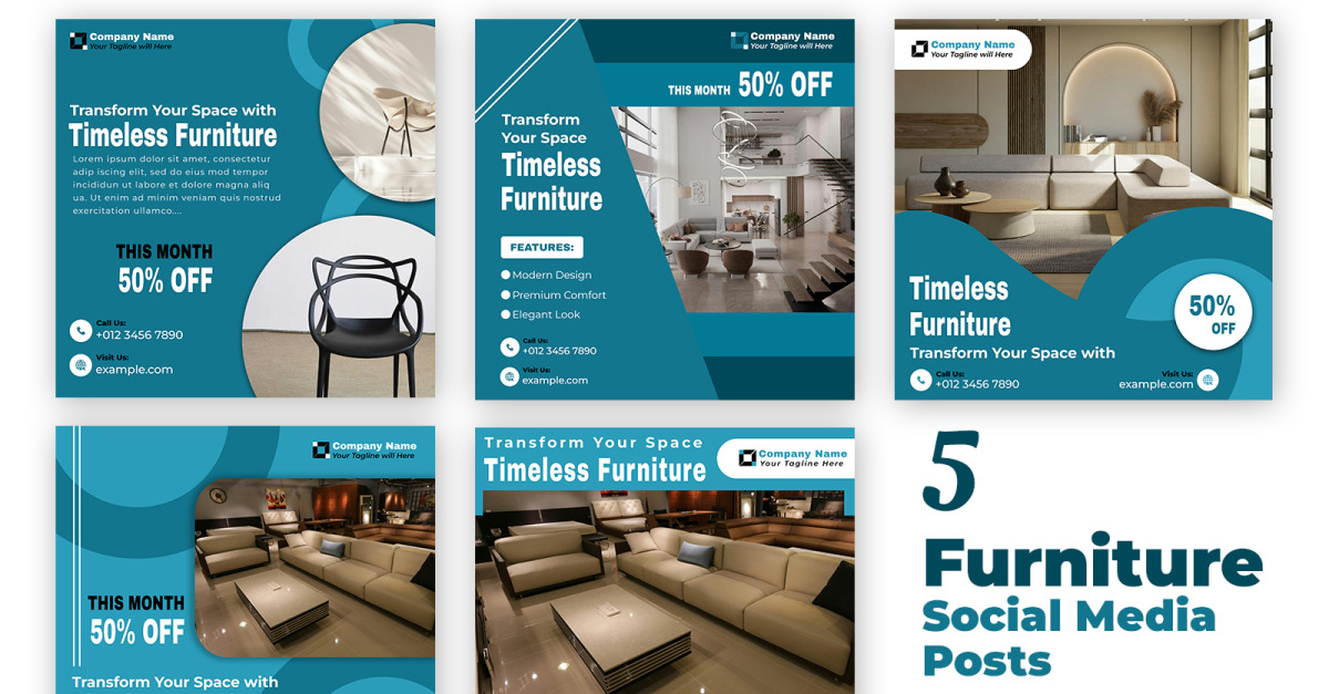 Modern Furniture Promo Templates PSD Boost your furniture marketing game with this clean and modern bundle of 5 social media post templates, specially crafted in Adobe Photoshop. Whether you’re promoting a new collection, running a seasonal sale, or building a consistent brand identity, these editable PSD files are all you need. Designed with furniture brands...