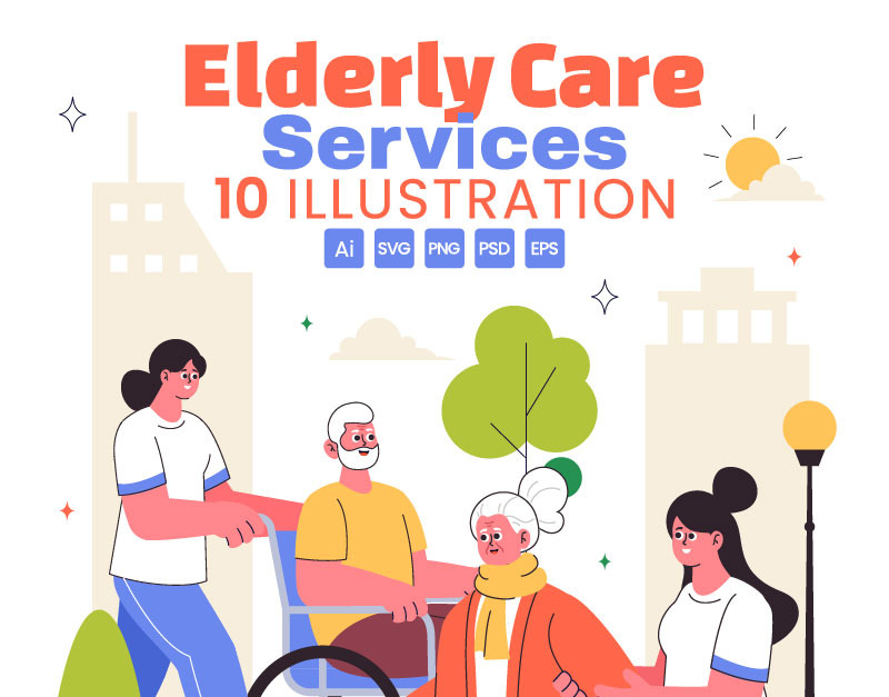 Elderly Care Services Vector Illustration Featuring Life with a Caregiver, Nursing Home, Assisted Living, and Support in a Flat Style Background Suitable for Poster, Web Banner, Brochure, Landing Page and Others Background Template Features: – Fully editable vector files, easy to edit the object, color and background – Include 100% vector Ai, Eps 10, SVG...