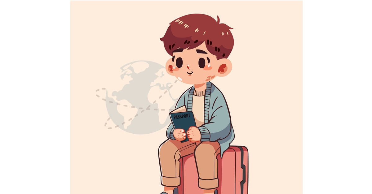 File Included : AI (CS6)EPS10Image 5000 x 5000 (px) **Looking for holiday travel inspiration? Check out this delightful cartoon boy sitting on luggage illustration for your next creative project!** **The illustration is a cartoon of a boy sitting on top of luggage. It captures the essence of travel and holiday adventures**