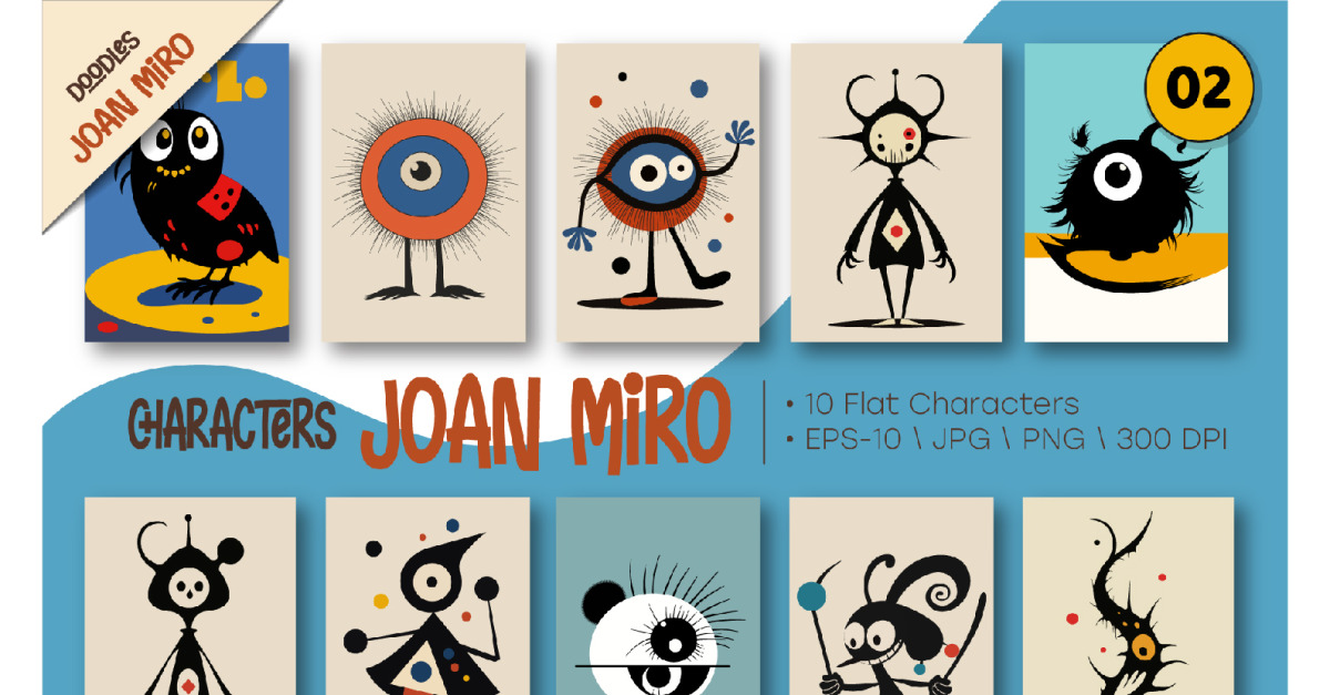 Characters in the style of Joan Miro 02. A set of whimsical characters in the style of Joan Miro. Minimalistic flat characters made of geometric shapes. Only 10 pieces. Ideal for making cards, scrapbooking and invitations, stationery, posters, wall hangings, surface patterns, packaging papers, social media, cases, quotes, blogs, web, banners and so on. —————————————–...