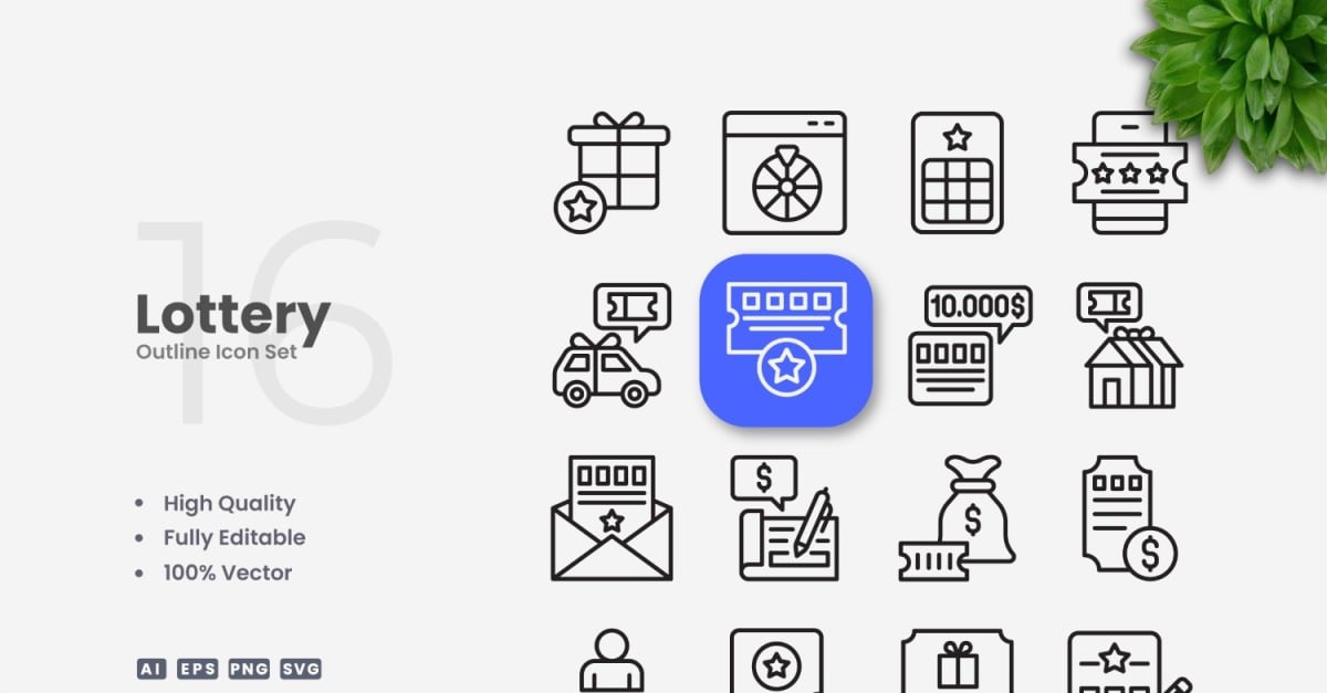 Set of 16 Lottery Outline Icons | Simple and clean design, perfect for websites, mobile apps, books, social media, infographics, flyer, print, banners, posters and many more. To resize or change color you can easily edit on vector software like Adobe Illustrator and CorelDRAW. Features : High Quality Design100% Vector100% CustomizableEditable StrokeEasy Drag and Drop Files...