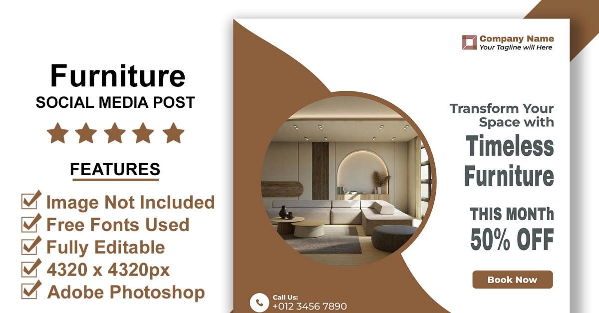 Luxury Furniture Sale Social Media Banner Post Template PSD for Interior Brands Promote luxury and high-end furniture with this sophisticated PSD post template for social media. Designed at 4320x4320px with 300 DPI, this Adobe Photoshop file includes smart object layers for effortless image updates. Ideal for luxury interior designers, boutique stores, and home décor campaigns,...