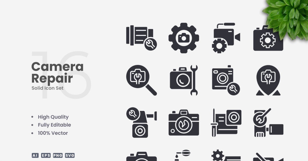 Set of 16 Camera Repair Solid Icons | Simple and clean design, perfect for websites, mobile apps, books, social media, infographics, flyer, print, banners, posters and many more. To resize or change color you can easily edit on vector software like Adobe Illustrator and CorelDRAW. Features : High Quality Design100% Vector100% CustomizableEasy Drag and Drop Files...